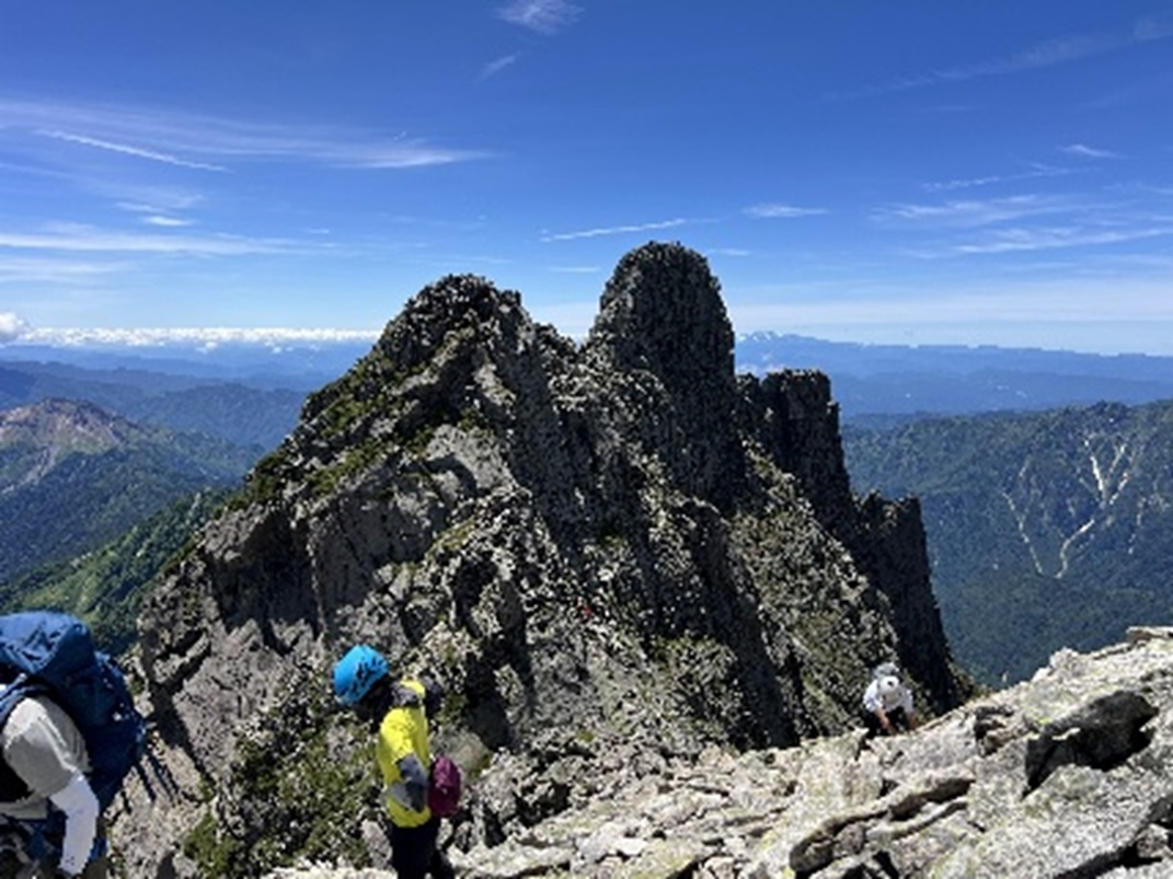 エスケープルートへの分岐だが、我々なら先へ進めると確信し山行を続行。そして、いよいよジャンダルム。…しかし、名物の“天使”はいなかった…海の日だから、海で休暇中だったのかもしれない。ラスボス・馬の背を無事に超え、ついに奥穂高岳へ。そして無事に穂高岳山荘にたどり着いた。