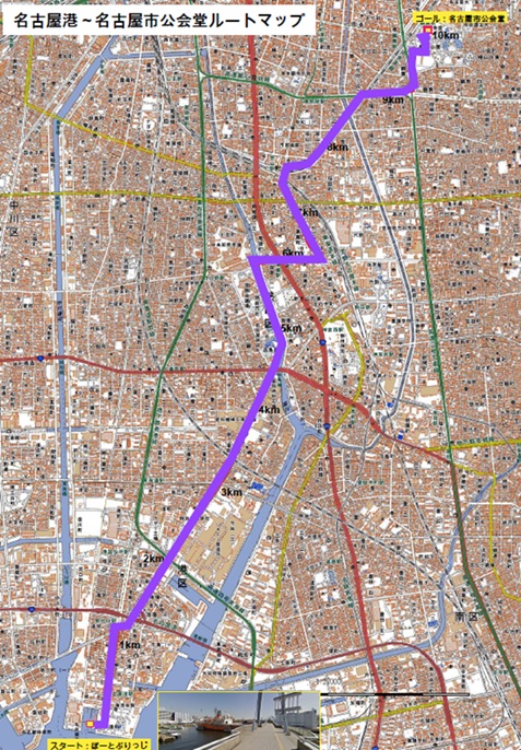 | コース状況 | ❶江川線の左側歩道を白鳥橋西まで北上す❷白鳥橋西交差点で道路右側に横断し、一番町10号線で堀川右岸の遊歩道(堀川千年プリムナート)❸遊歩道を西川並まで進み右折し幡屋橋を渡って雁道線の右側歩道を西高蔵まで進む。❹西高蔵交差点で雁道線の左側に渡り、雁道線を高蔵まで進む。❺高蔵の交差点で左折し大津通を金山まで進み、金山橋の交差点で大津通を横断❻JR中央線の北側の古沢流町線を中央線に沿って大清水へ❼大清水で右折し山王線を東郊通2まで進み交差点を渡ってから空港線を北上❽鶴舞公園のウエストグラウンド西側から鶴舞公園に入り公会堂へ |
